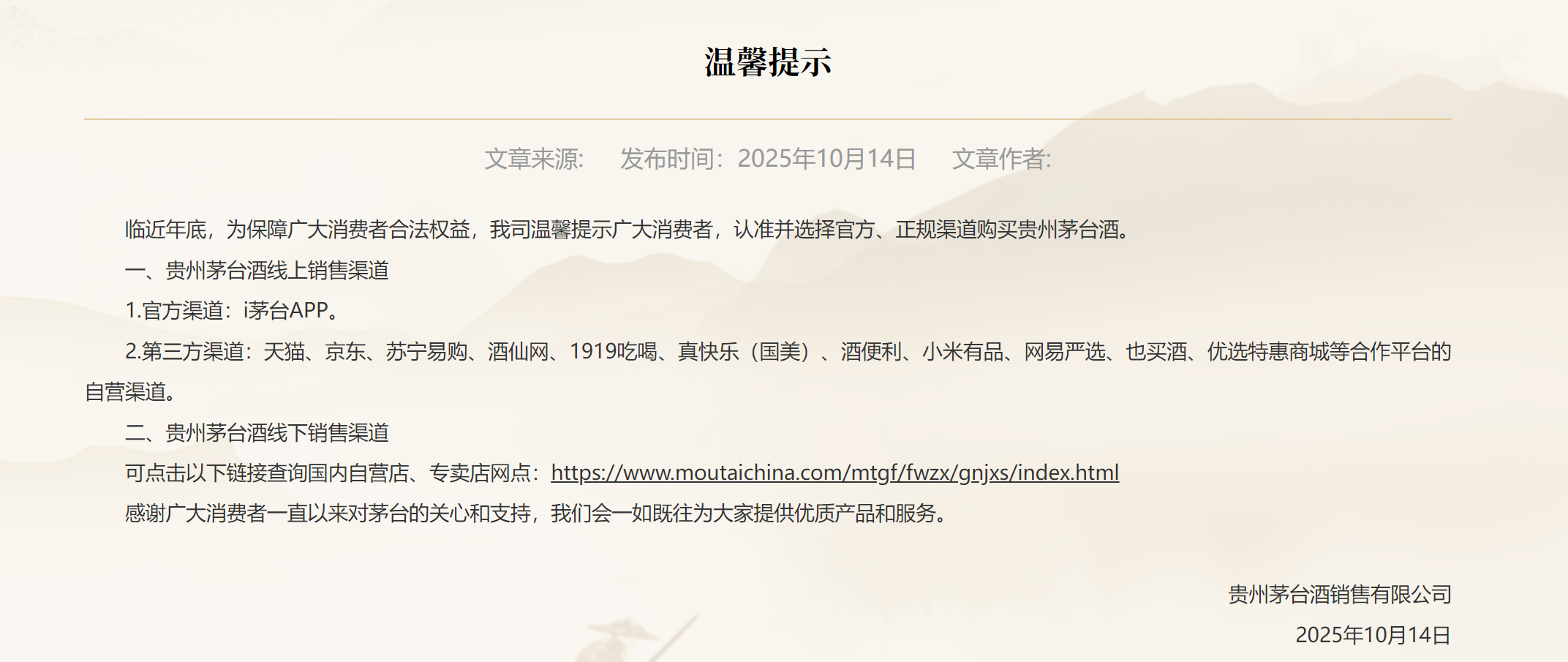 在2025年三季度业绩说明会上,贵州茅台表示,公司强化了市场管控、加大了整治力度,暂停了部分渠道的供货。当前重点是维护市场的健康、稳定、韧性。