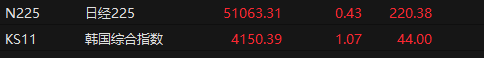 上证报中国证券网讯 11月12日,日韩股市收盘齐涨。日经225指数收涨0.43%,报51063.31点;韩国综合指数收涨1.07%,报4150.39点。