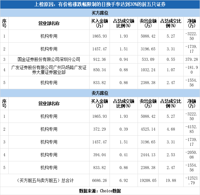 龙虎榜数据显示,今日共8个机构席位出现在龙虎榜单上,分别位列买一、买二、买五、卖一、卖二、卖三、卖四、卖五,合计净卖出1.27亿元,占龙虎榜净卖额的101.58%。