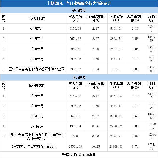 龙虎榜数据显示,今日共8个机构席位出现在龙虎榜单上,分别位列买一、买二、买三、买四、卖一、卖二、卖三、卖四,合计净买入3084.42万元,占龙虎榜净买额的82.21%。