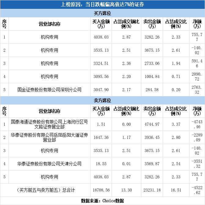 多主力现身龙虎榜,京泉华跌停(11-12)