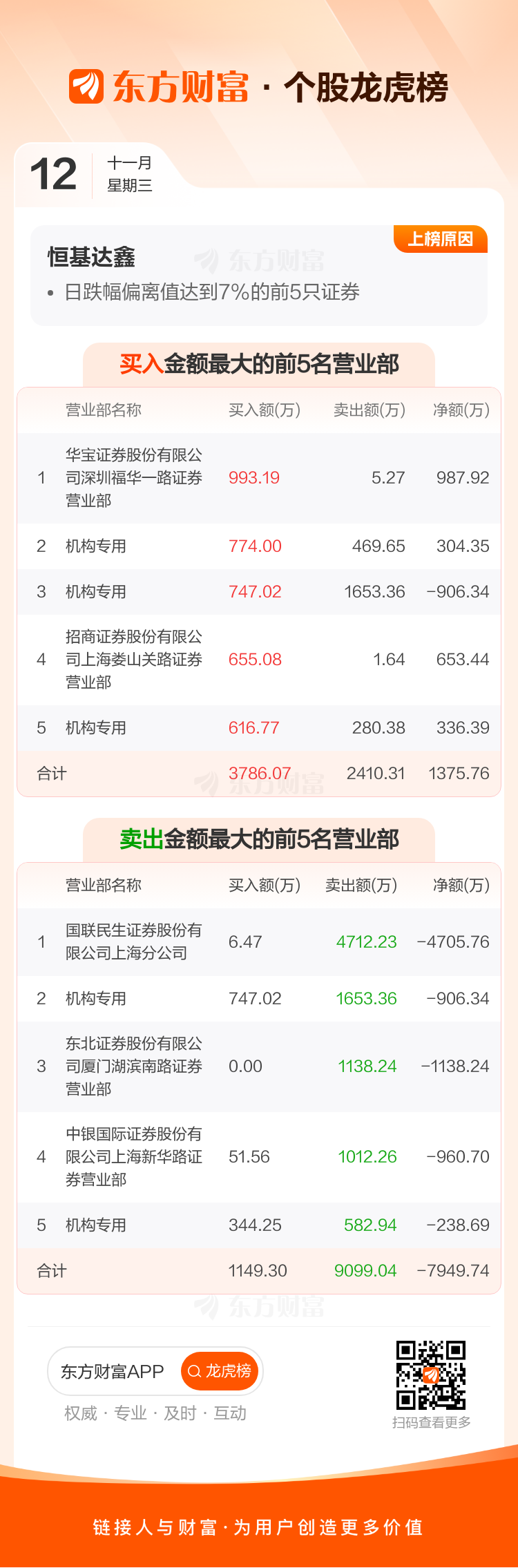 恒基达鑫(002492)龙虎榜数据(11-12)