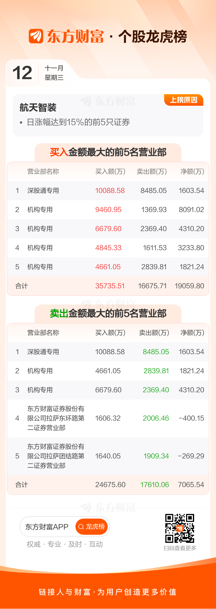 交易所2025年11月12日公布的交易公开信息显示,航天智装因成为日涨幅达到15%的前5只证券上榜。航天智装当日收报27.15元,涨跌幅16.57%,偏离值16.57%,换手率12.11%,成交额21.32亿。