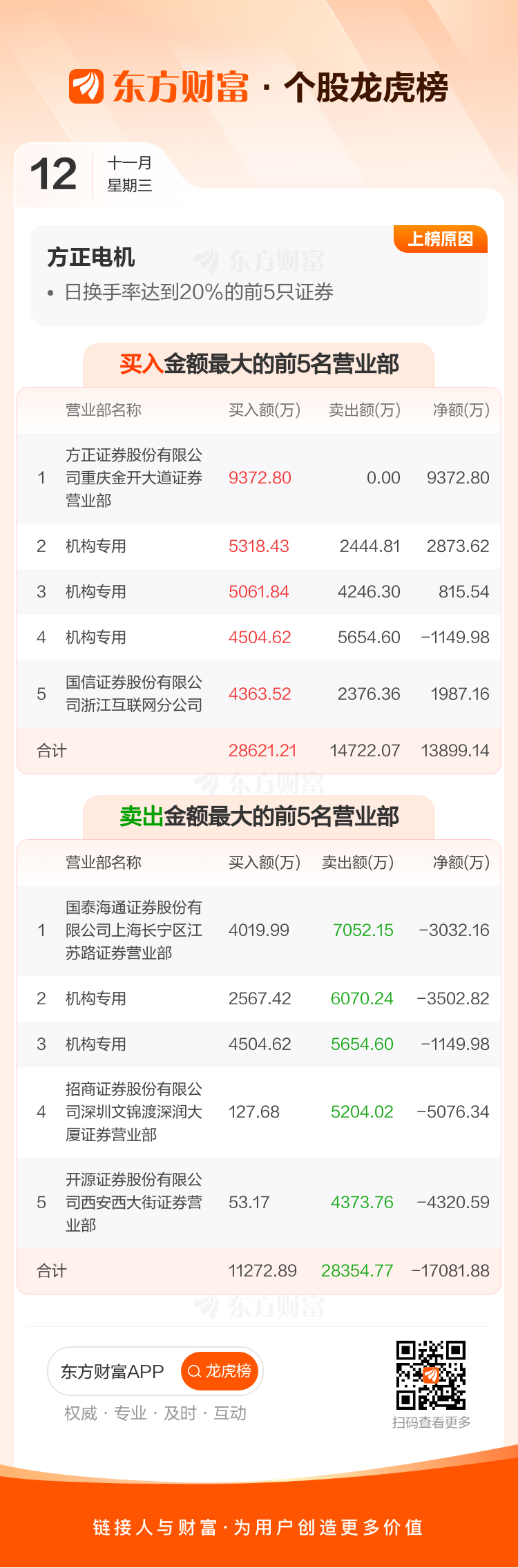 交易所2025年11月12日公布的交易公开信息显示,方正电机因成为日换手率达到20%的前5只证券、连续三个交易日内,涨幅偏离值累计达到20%的证券上榜。方正电机当日收报16.92元,涨跌幅5.88%,偏离值40.76%,换手率40.77%,成交额33.59亿。异常期间11月10日至11月12日,期间涨幅19.91%,累计偏离值20.37%,区间成交额90.65亿。