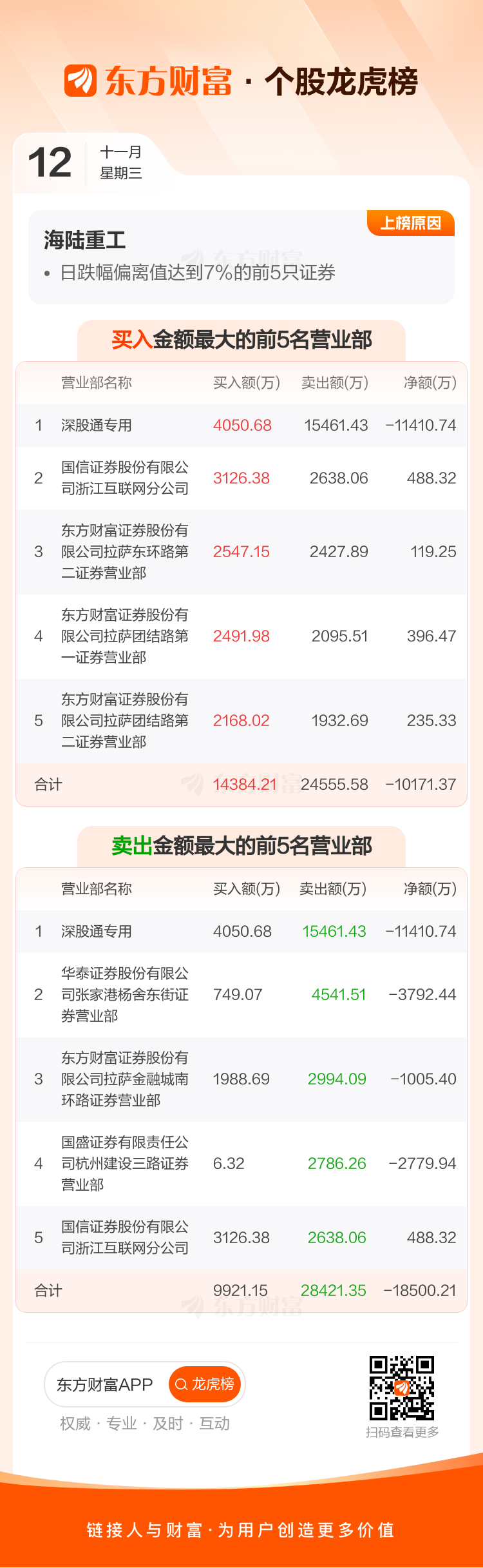 交易所2025年11月12日公布的交易公开信息显示,海陆重工因成为日跌幅偏离值达到7%的前5只证券上榜。海陆重工当日收报12.47元,涨跌幅-9.64%,偏离值-9.25%,换手率32.64%,成交额26.48亿。
