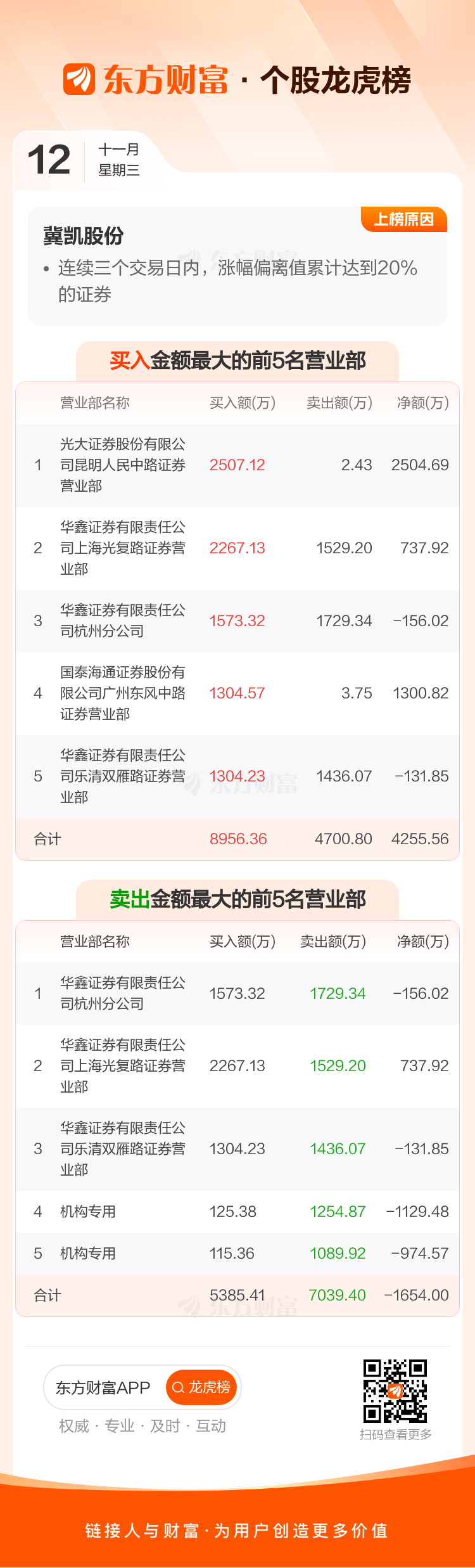交易所2025年11月12日公布的交易公开信息显示,冀凯股份因成为连续三个交易日内,涨幅偏离值累计达到20%的证券上榜。冀凯股份当日收报10.29元,涨跌幅10.05%,换手率8.96%,成交额3.09亿。异常期间11月11日至11月12日,期间涨幅21.06%,累计偏离值21.91%,区间成交额4.48亿。