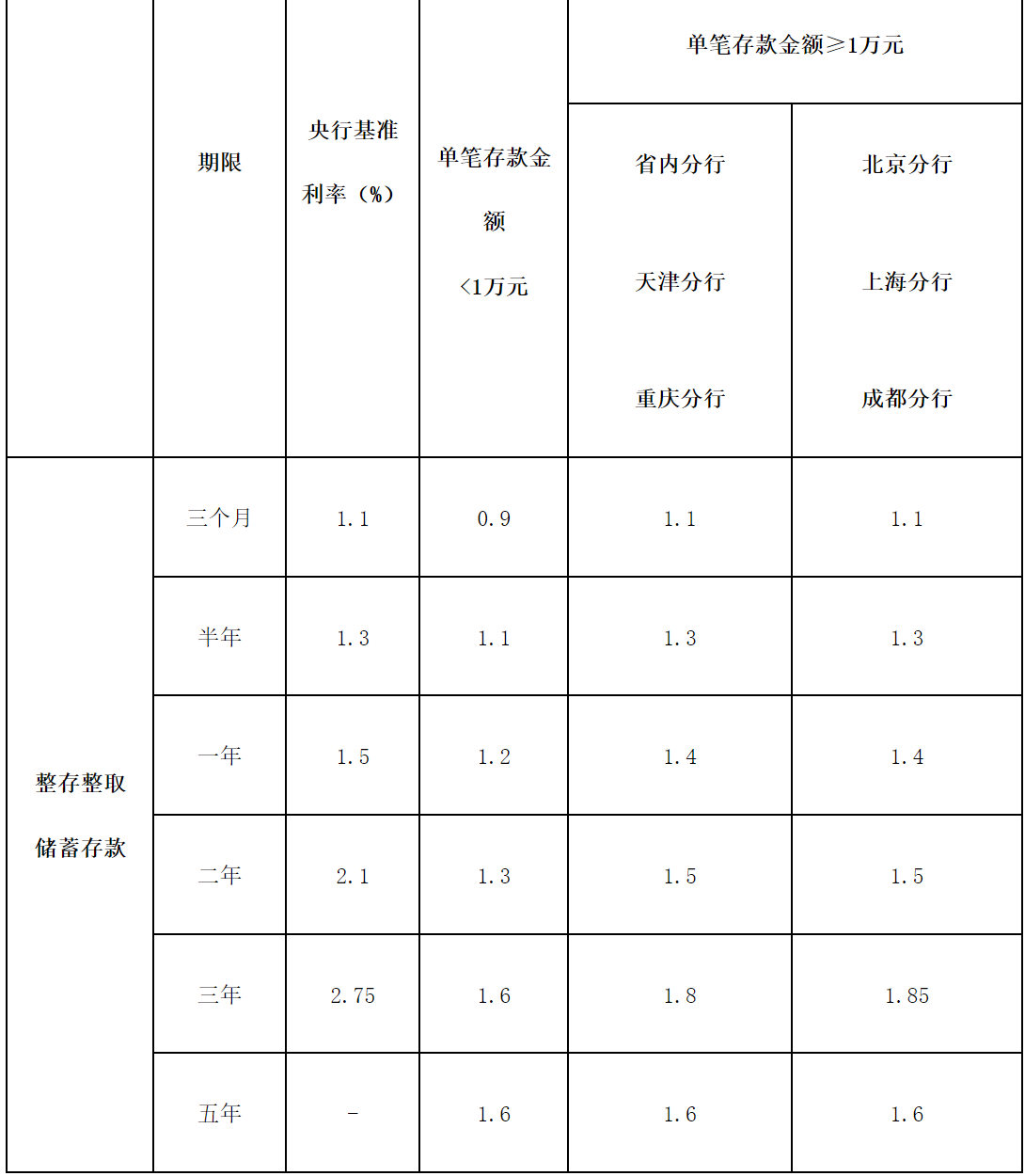 大连银行针对单笔1万元及以上的存款,在不同分行执行差异化的三年期利率:省内分行、天津分行及重庆分行为1.8%,而北京、上海及成都分行为1.85%。虽然三年期利率存在差异,但其五年期利率已统一低于所有分行的三年期水平,均为1.6%,利率倒挂现象明显。