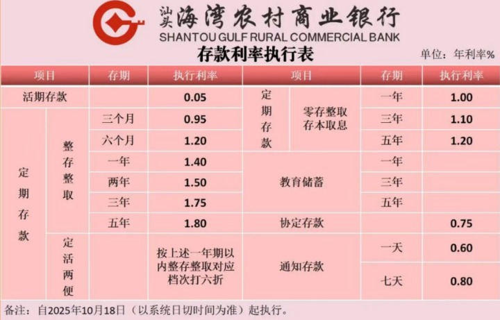 汕头海湾农商银行自10月18日执行最新存款利率,一年、二年期定期存款利率下调15BP至1.4%和1.5%,三年、五年期定期存款利率下调20BP至1.75%和1.8%。