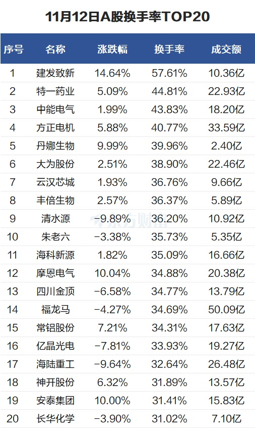 当天换手率最高的个股为建发致新,全天换手率57.61%。特一药业紧随其后,全天换手率44.81%。