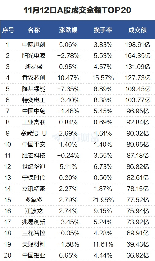活跃个股:中际旭创成交199亿元 建发致新换手率58%