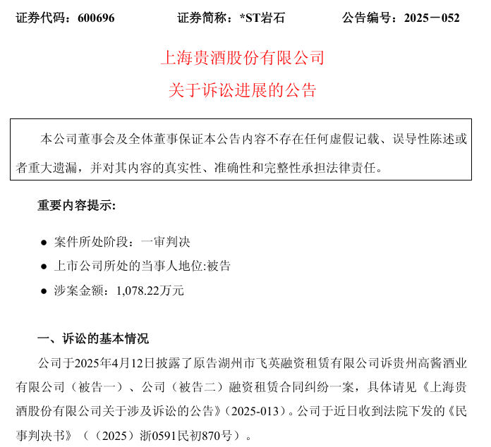 一审败诉 *ST岩石需连带清偿高酱酒业千万余元债务 公司前三季度营收跌85%、亏损扩至超亿元