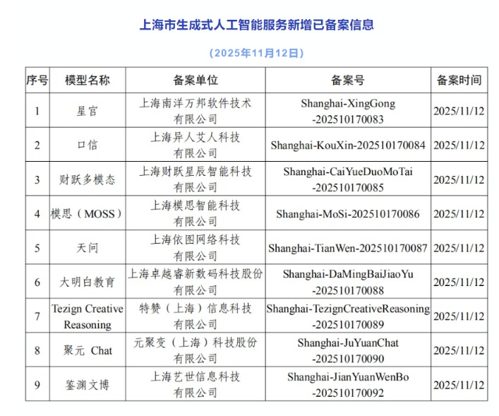 上海新增9款已完成备案的生成式人工智能服务