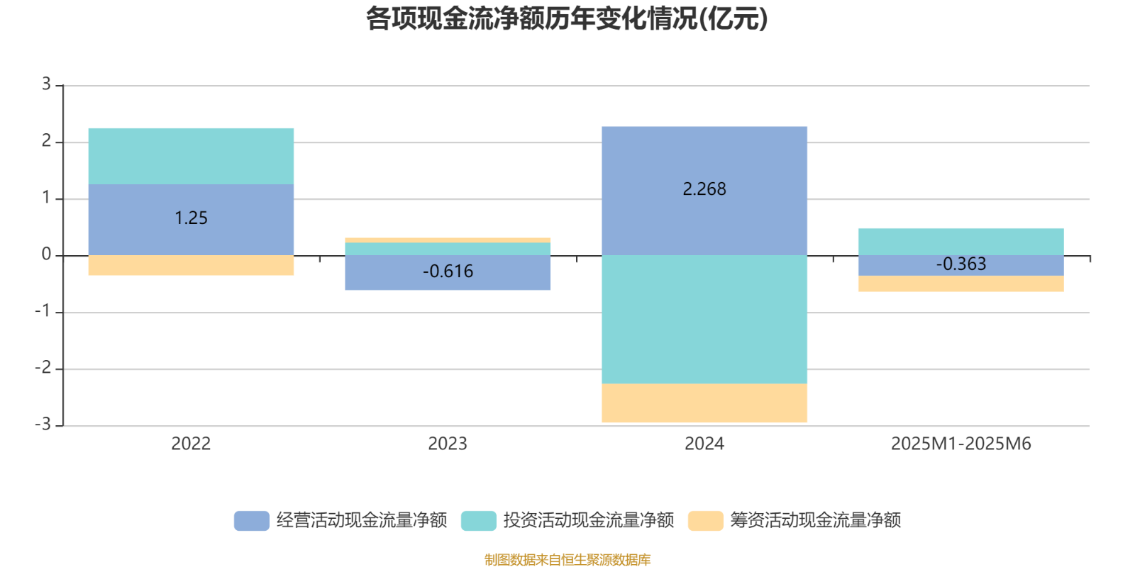 2025年1月至6月,公司经营活动现金流净额为-3627.5万元,同比减少6520.5万元;筹资活动现金流净额-2818.8万元,同比减少1720.2万元;投资活动现金流净额4711.9万元,上年同期为-6557.1万元。