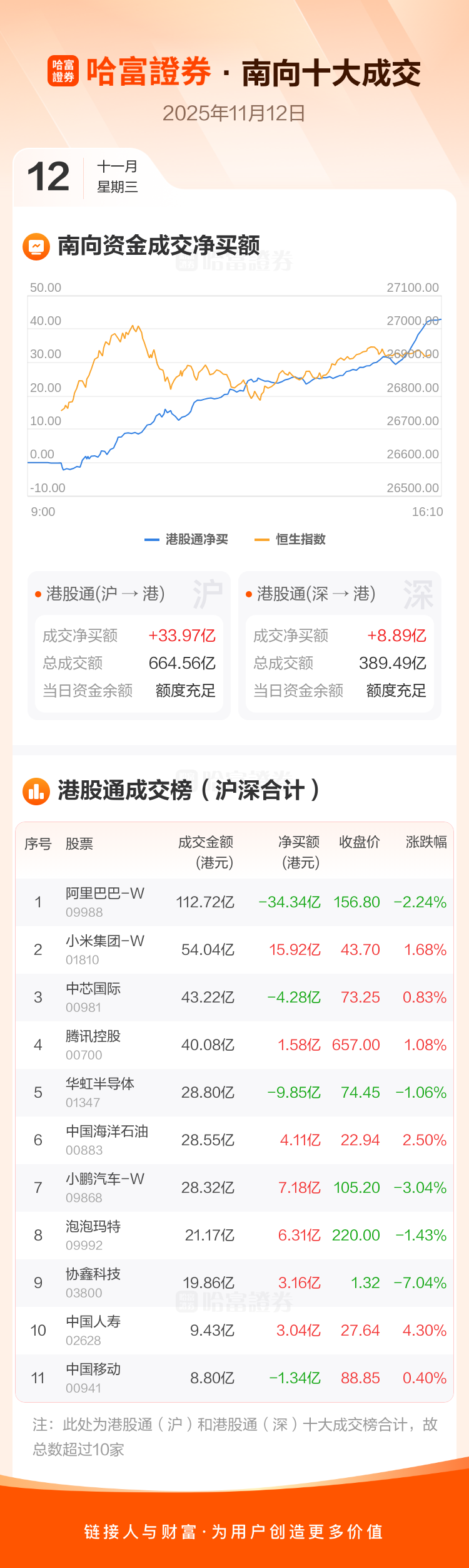 恒生指数11月12日涨0.85%,收报26922.73点。南向资金今日净买入港股42.86亿港元。南向资金今日成交额1054.05亿港元,港股大市成交2363.95亿港元。