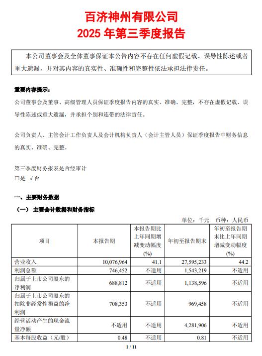 百济神州(688235.SH)发布2025年第三季度报告,第三季度营收为100.77亿元,同比增长41.1%;净利润为6.89亿元,同比扭亏为盈。前三季度营收为275.95亿元,同比增长44.2%;净利润为11.39亿元,同比扭亏为盈。业绩变动主要系由于产品收入增长和费用管理推动了经营效率的提升。