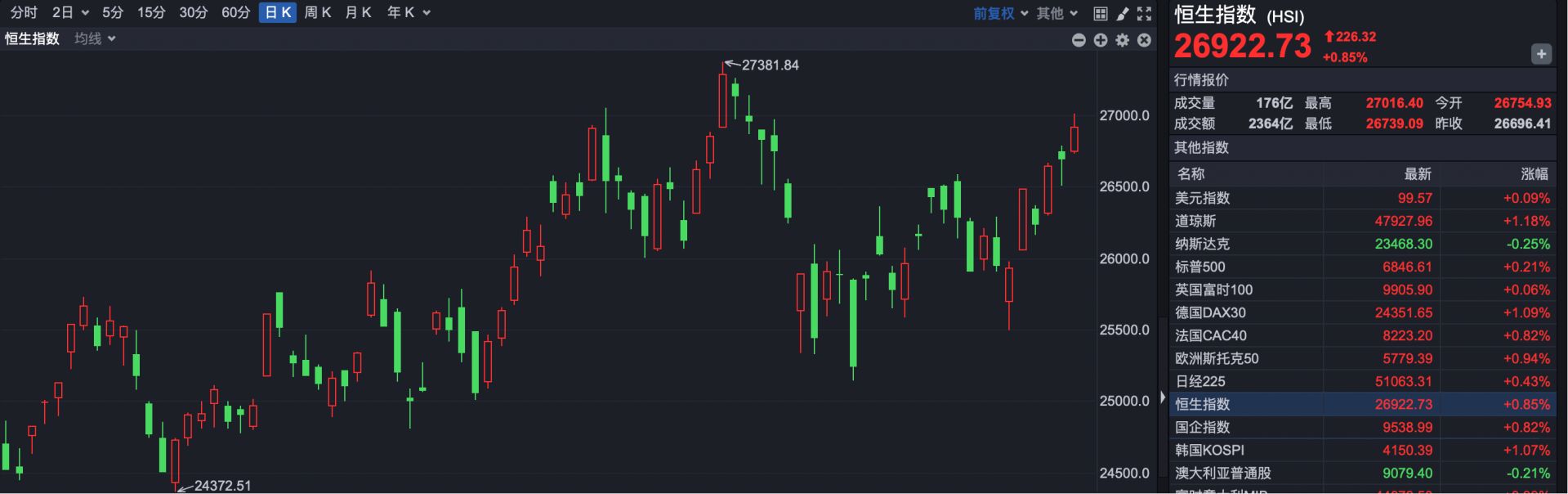 截至收盘,恒指报收于26922.73点,上涨226.32点,涨幅0.85%。