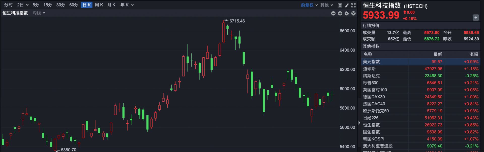 恒生科技指数报收于5933.99点,上涨9.60点,涨幅0.16%。