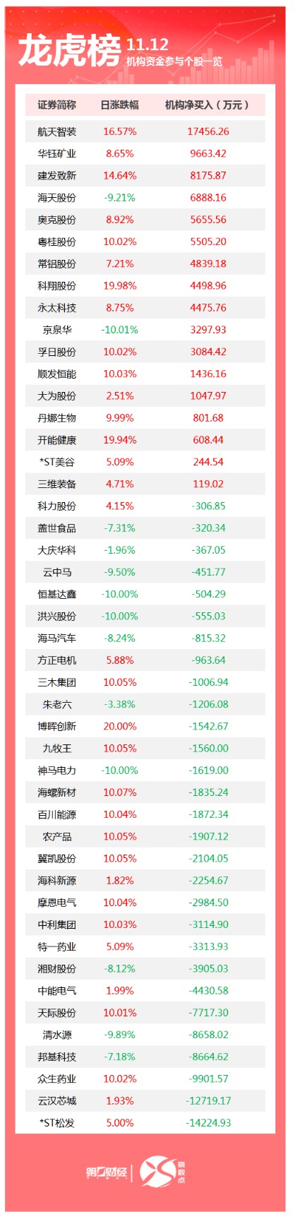 盘后数据显示,11月12日龙虎榜中,共46只个股出现了机构的身影,有17只股票呈现机构净买入,29只股票呈现机构净卖出。