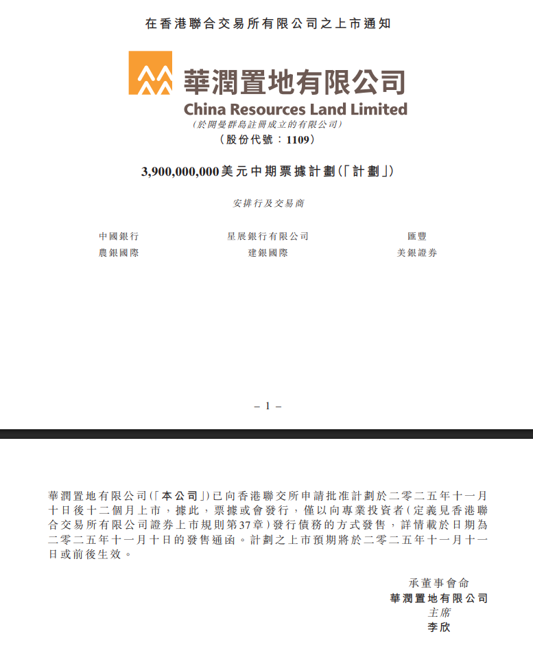 华润置地近日发布公告称,已向香港联交所申请批准39亿美元中期票据计划于2025年11月10日后12个月上市,仅以向专业投资者发行债务的方式发售,安排行及交易商包括中国银行、星展银行、汇丰、农银国际、建银国际、美银证券。