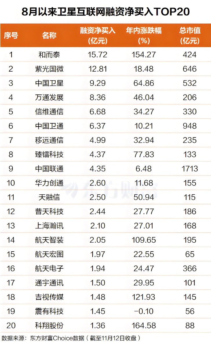 东方财富Choice数据显示,8月以来杠杆资金吸筹多只卫星互联网概念股,其中和而泰排名第一,融资净买入近16亿元;紫光国微排名第二,融资净买入近13亿元。