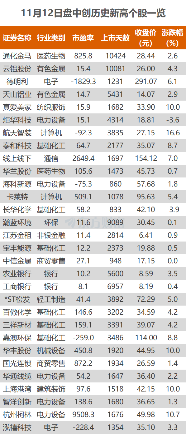 11月12日,A股三大指数今日震荡整理,沪指险守4000点关口。截止收盘,沪指跌0.07%,收报4000.14点;深证成指跌0.36%,收报13240.62点;创业板指跌0.39%,收报3122.03点。东方财富Choice数据显示,今日有30只个股盘中股价创历史新高,分别为农业银行、德明利等。