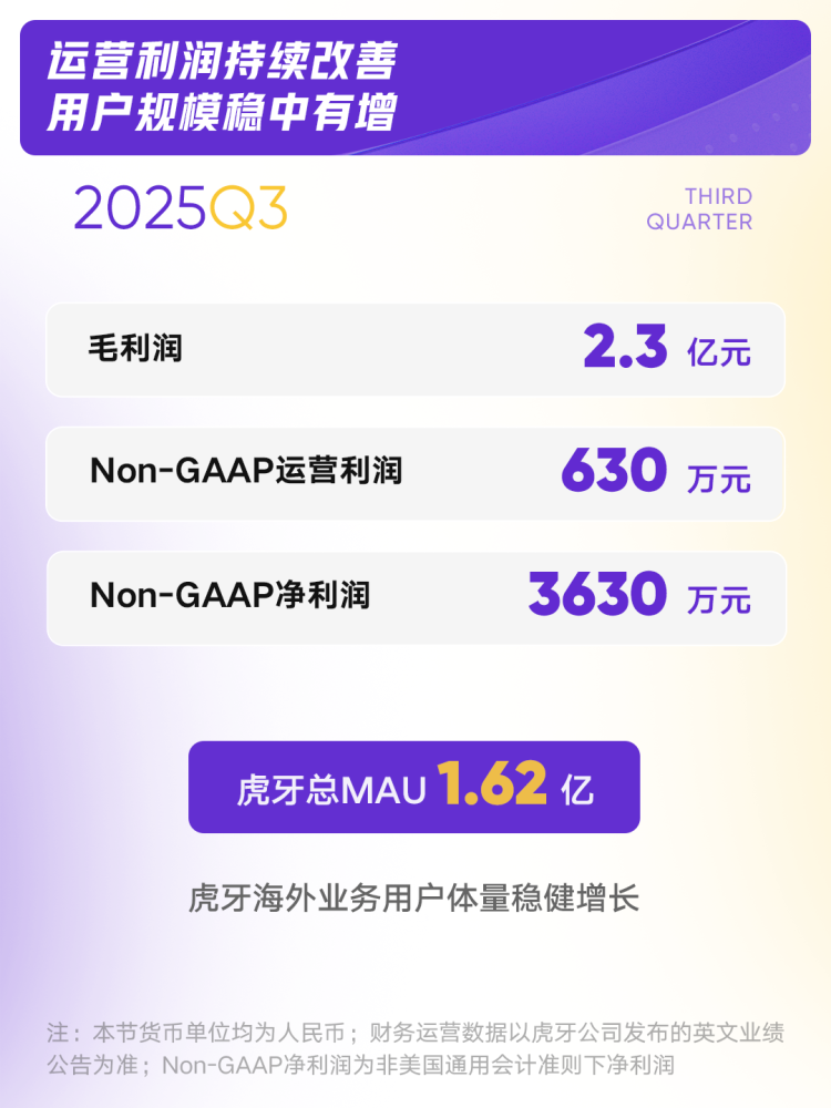 虎牙公司于11月12日公布了2025年第三季度财报。财报显示,该季度虎牙公司总收入达16.9亿元,创近九个季度以来新高,同比增速提升至约10%。其中,直播收入企稳回升,达11.6亿元;游戏相关服务、广告和其他业务保持快速增长,该板块收入同比上涨约30%至5.3亿元,占总收入比例提高至31.5%。在非美国通用会计准则下,该季度公司实现运营利润630万元,归属于虎牙公司的净利润3630万元。用户数据方面,2025年第三季度,虎牙总MAU达到1.62亿元。