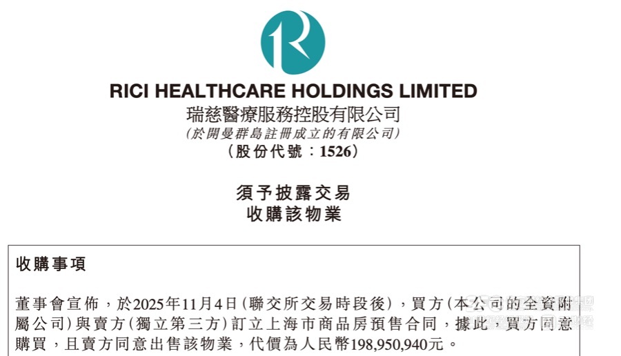 11月4日晚间,瑞慈医疗(01526.HK)发布公告,其间接全资附属公司上海瑞慈瑞铂门诊部有限公司购入上海徐汇滨江云锦东方三期一套联排别墅,耗资约1.99亿元人民币(下同)。瑞慈医疗同时披露,购房款将由公司内部资源拨付,无需外部融资。