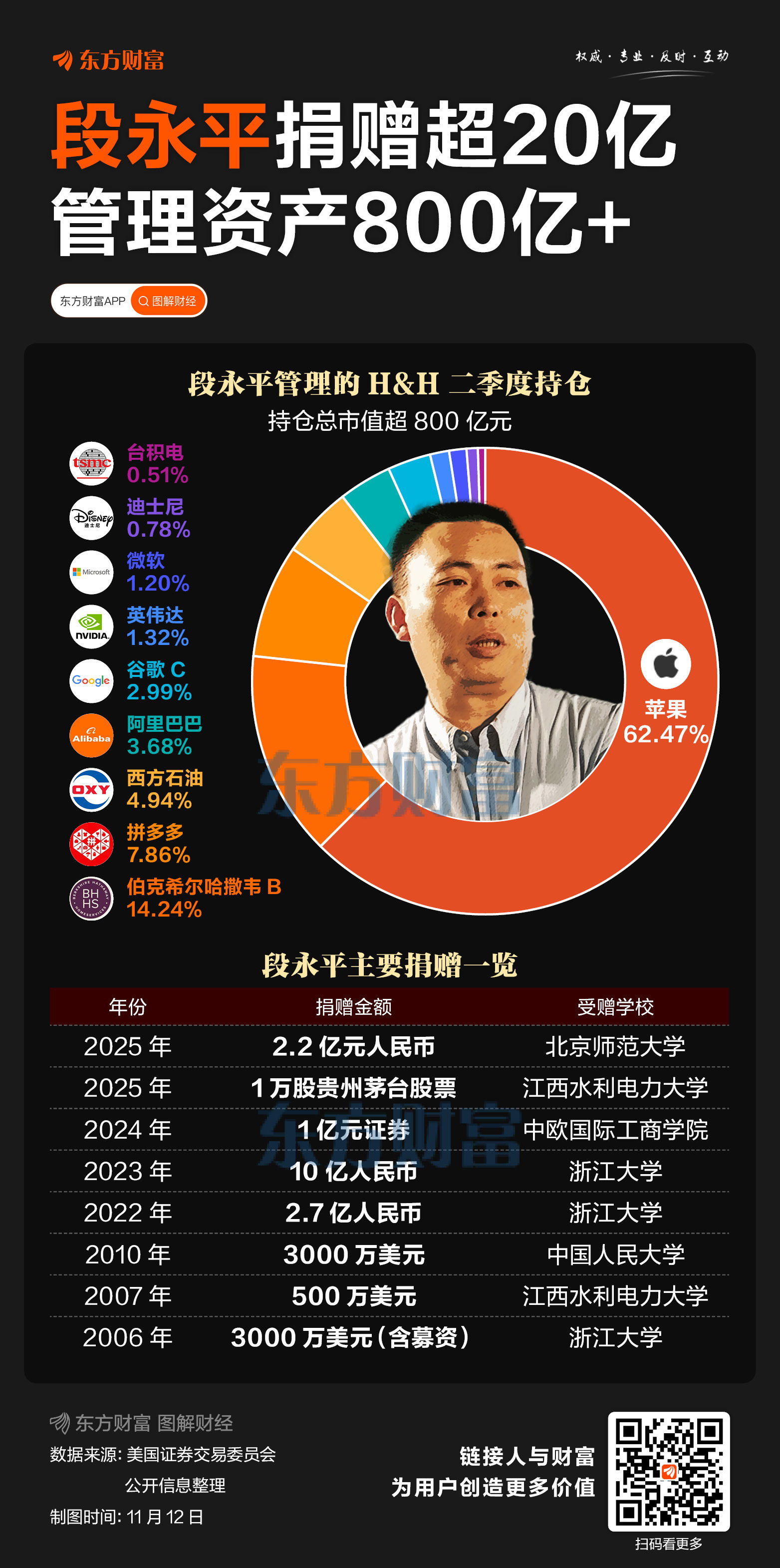 就其本人资产来看,2025年3月,段永平以100亿人民币财富位列《胡润全球富豪榜》榜单2575位。而根据美国证券交易委员会披露的数据,2025年6月30日,段永平管理的投资机构H&H International Investment的持仓总市值为115亿美元,约为800多亿人民币。其持仓共有十只股票,前三位分别为苹果(62.47%)、伯克希尔哈撒韦B股(14.24%)和拼多多(7.86%),前三位占比接近85%。