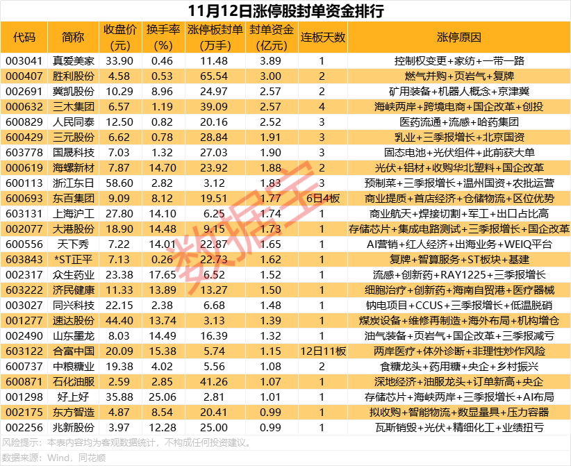 以封单金额计算,23股封单资金均超1亿元,真爱美家、胜利股份、冀凯股份封单资金居前,分别为3.89亿元、3亿元、2.57亿元。