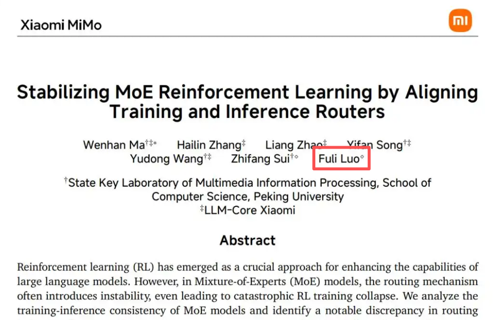 今年10月,小米AI团队携手北京大学联合发布一篇聚焦MoE与强化学习的论文,其中出现了罗福莉的名字。有消息称,该篇论文是罗福莉加入小米体系后的首个公开研究成果,标志着她将研究重心正式带入工程落地与系统稳定性方向。