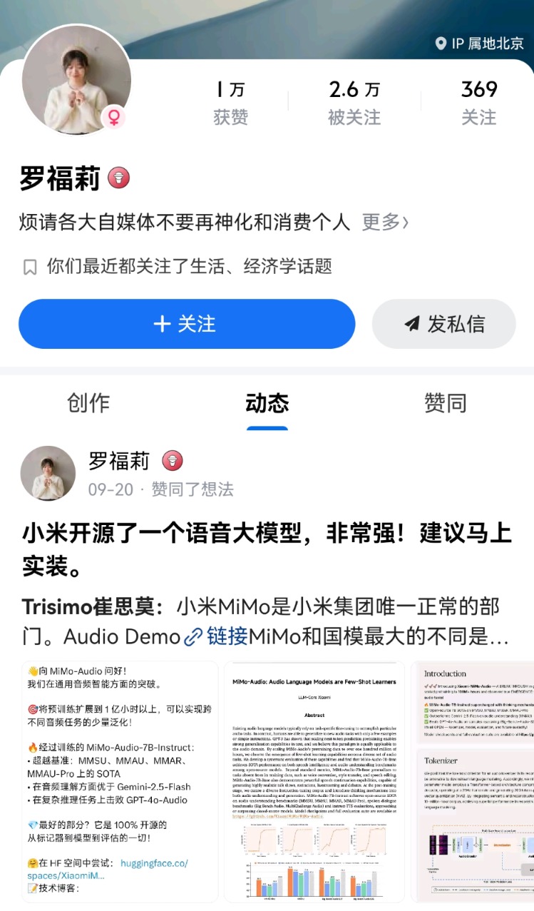 罗福莉知乎账号的最新动态显示,她在今年9月赞同了小米语音大模型开源的相关话题。