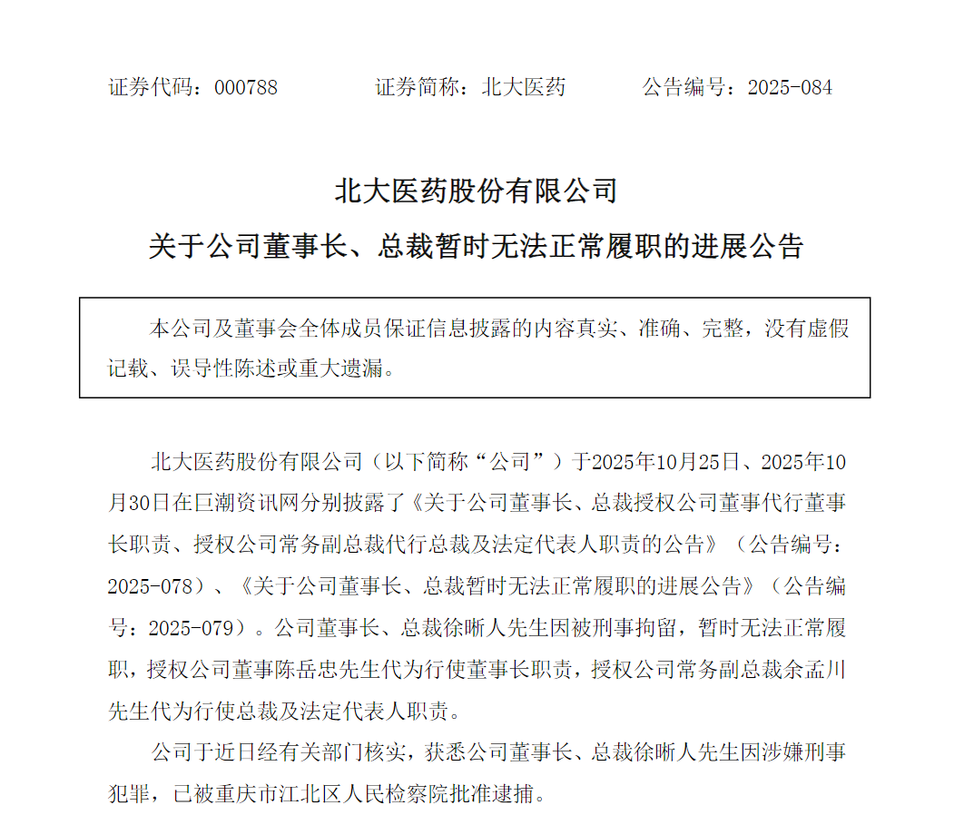 11月12日,北大医药公告,公司于近日经有关部门核实,获悉公司董事长、总裁徐晰人因涉嫌刑事犯罪,已被重庆市江北区人民检察院批准逮捕。