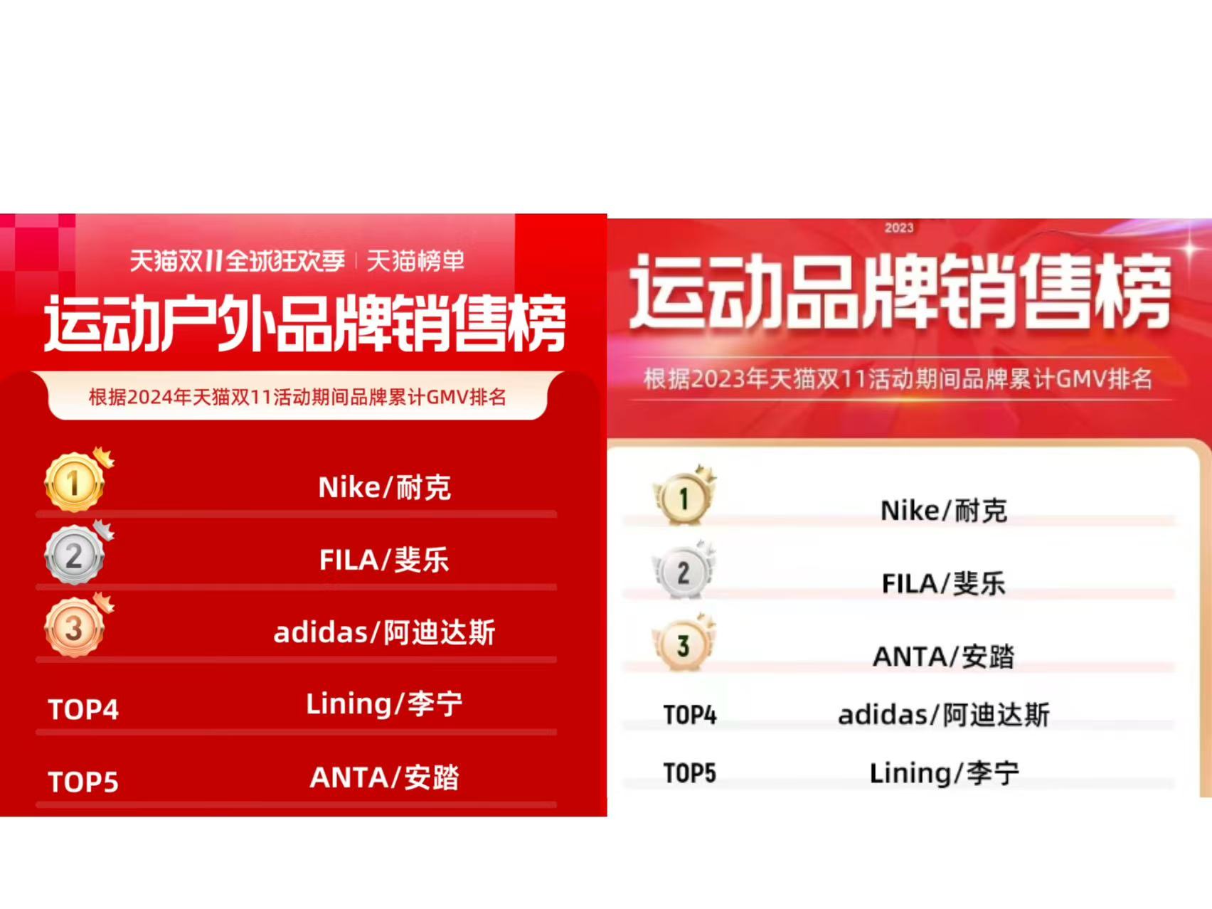 2024年天猫公布的双十一运动品牌销售前5名分别是耐克、斐乐、阿迪达斯、李宁、安踏;2023年的排行则是耐克、斐乐、安踏、阿迪达斯、李宁。