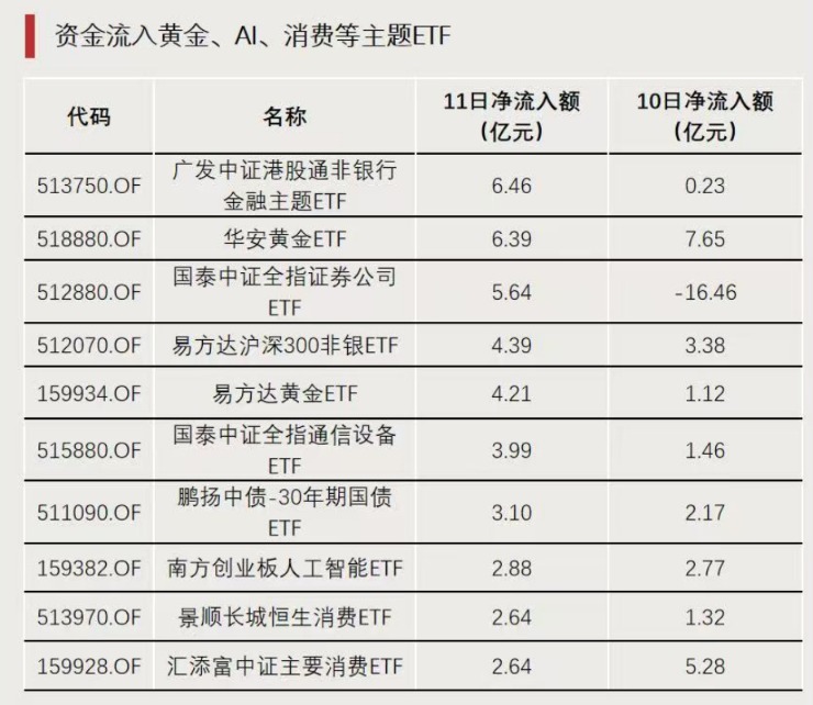 近日,资金流向多个热门板块。本周前两个交易日,金价走强,华安黄金ETF两日吸金超14亿元。此外,多只消费、人工智能主题的ETF亦获资金加仓。