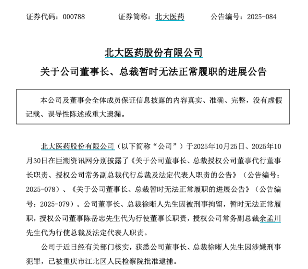 此前于10月24日,北大医药发布公告称,徐晰人因个人原因暂时无法履职,授权公司董事陈岳忠代为行使董事长职责,授权公司常务副总裁余孟川代为行使总裁及法定代表人职责。10月29日,北大医药公告称,徐晰人被刑事拘留,正在配合相关部门调查,暂时无法正常履职。