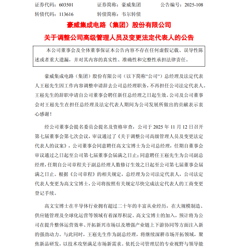 11月12日晚间,豪威集成电路(集团)股份有限公司(下称“豪威集团”)发布多条公告,宣布调整公司高级管理人员及变更法定代表人。
