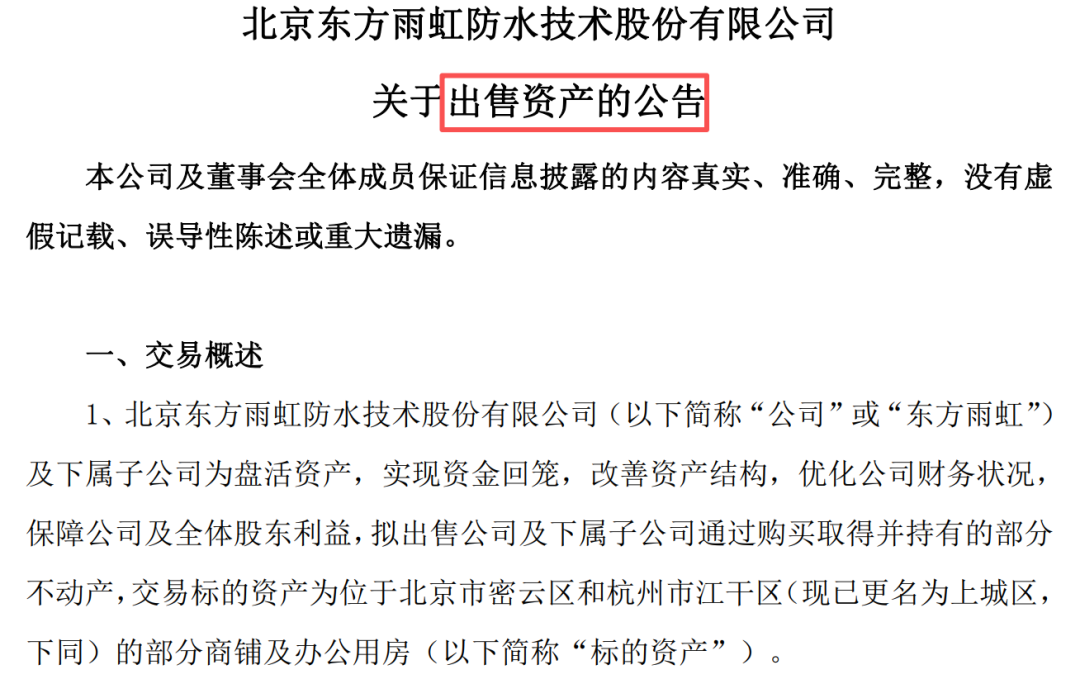 【导读】东方雨虹“亏本”出售北京及杭州物业,近期持续抛售资产
