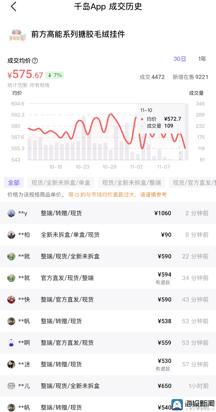 11月12日上午,记者在二级市场了解到,经过前夜的大规模补货,前方高能系列价格再次出现下跌。整盒的成交均价从前日的572元降至551元上下,降幅在3.6%,隐藏款“本我”的二手价格更是出现大幅下跌,从前日639元的成交均价降至565元上下,甚至有人以440元的低价成功入手,最大降幅高达31%。