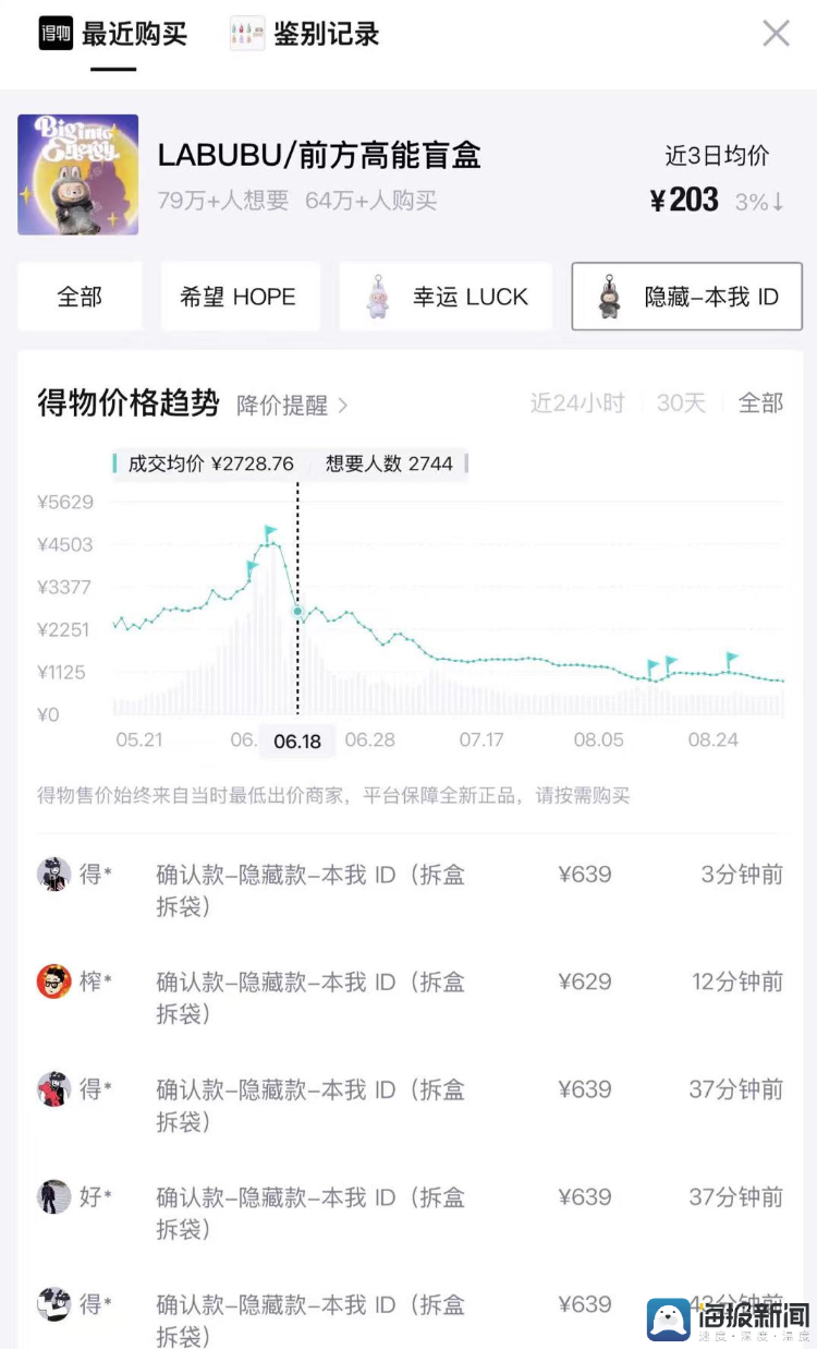 大规模补货直接引发二手市场价格震荡。11月12日上午,据二手交易平台千岛APP的数据,LABUBU 3.0系列单个盲盒的成交均价从6月的1100元跌至当前200元左右,接近99元/个的原价水平。其中曾被炒至4500元的隐藏款“本我”,最新成交均价仅565元,较峰值跌幅超87%,甚至有人以440元的低价交易成功,部分拆盒未拆袋的单品甚至低至400元。