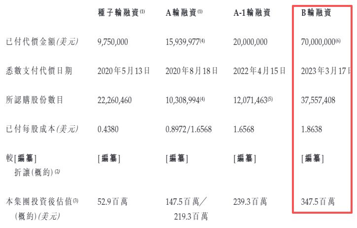 招股书显示,公司最后一轮融资发生在2023年3月17日的B轮。该轮融资筹得7000万美元,已付每股成本1.8638美元,投后估值达到3.475亿美元。