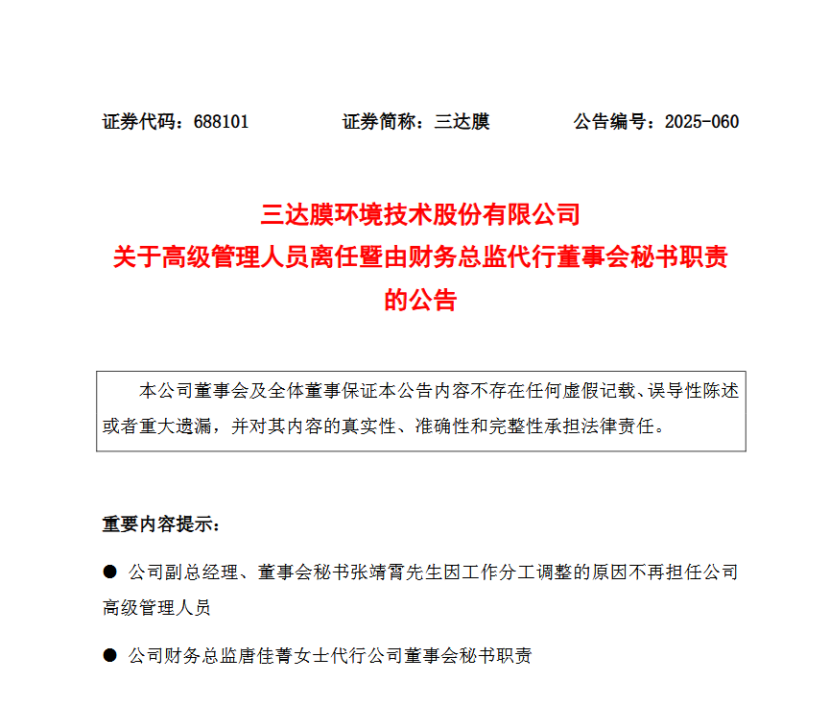 其中,三达膜原副总经理、董事会秘书张靖霄因工作分工调整,不再担任高级管理人员,转而出任公司纳滤技术应用与推广中心总经理及联席证券事务代表;公司财务总监唐佳菁将代行董事会秘书职责。