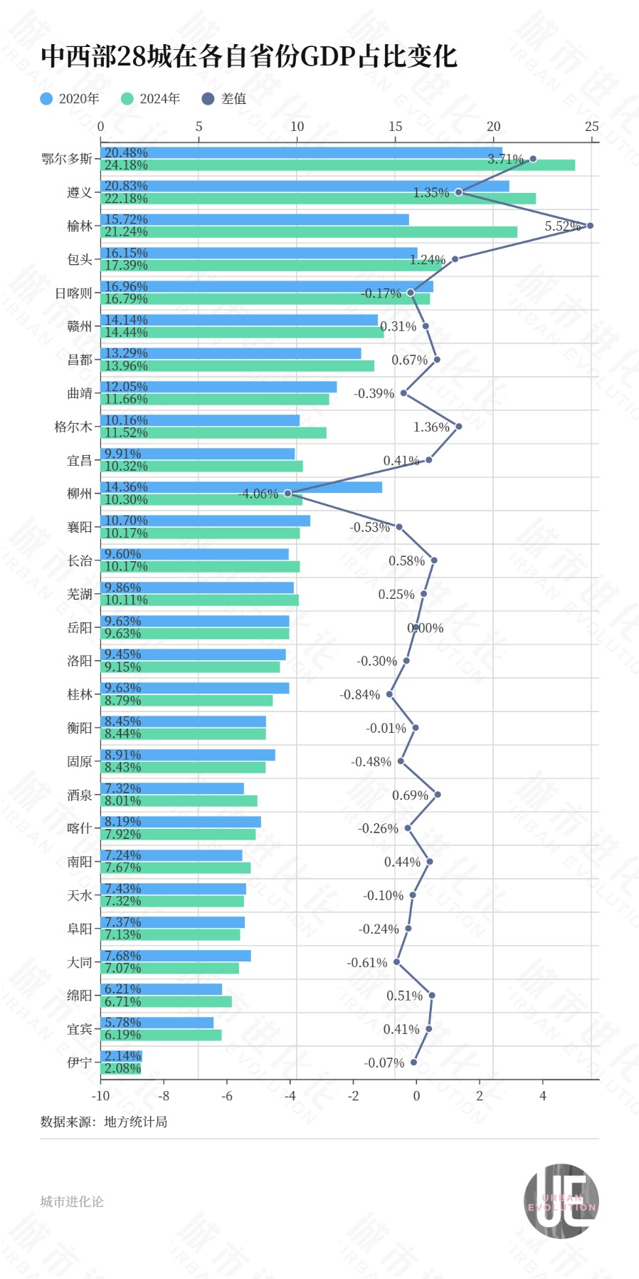 这几乎相当于在短短四年内“增长了一个柳州”。在此期间,榆林和鄂尔多斯GDP也分别从中西部省域副中心城市第4位、第10位跃升至前两位。尤其是,2024年榆林和鄂尔多斯在全省(区)的GDP占比分别为21.24%、24.18%,增长极的作用显露无疑。