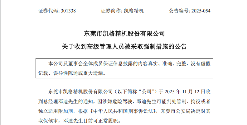 11月12日晚间,凯格精机发布公告称,公司当日收到总经理邓迪的通知,其因涉嫌危险驾驶,可能被判处管制、拘役或独立适用附加刑。