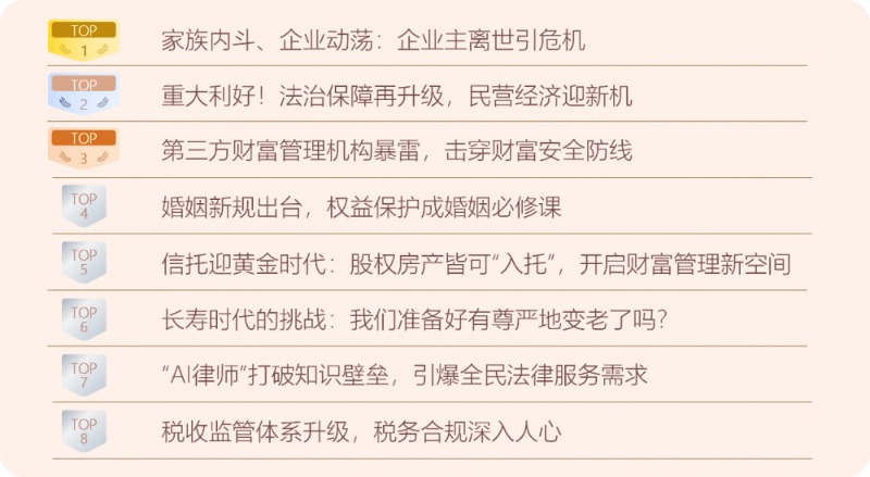3.风险图谱,动态升级:在2023年基础法律风险图谱之上,深挖婚姻、传承、养老、企业四大领域的风险新趋势,探索更前瞻、更具针对性的风险防范路径。