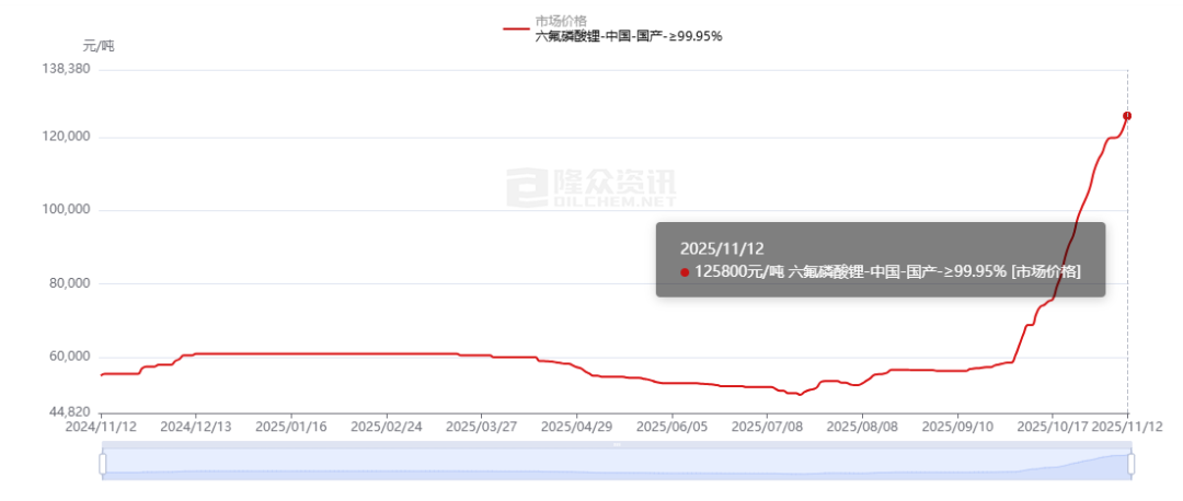 六氟磷酸锂是当前锂电产业链中“当红”的中游材料,产品价格进入10月份一路狂飙。若按六氟磷酸锂在7月18日的年内低点4.98万元/吨测算,相对于11月12日的12.58万元/吨,已上涨153%。