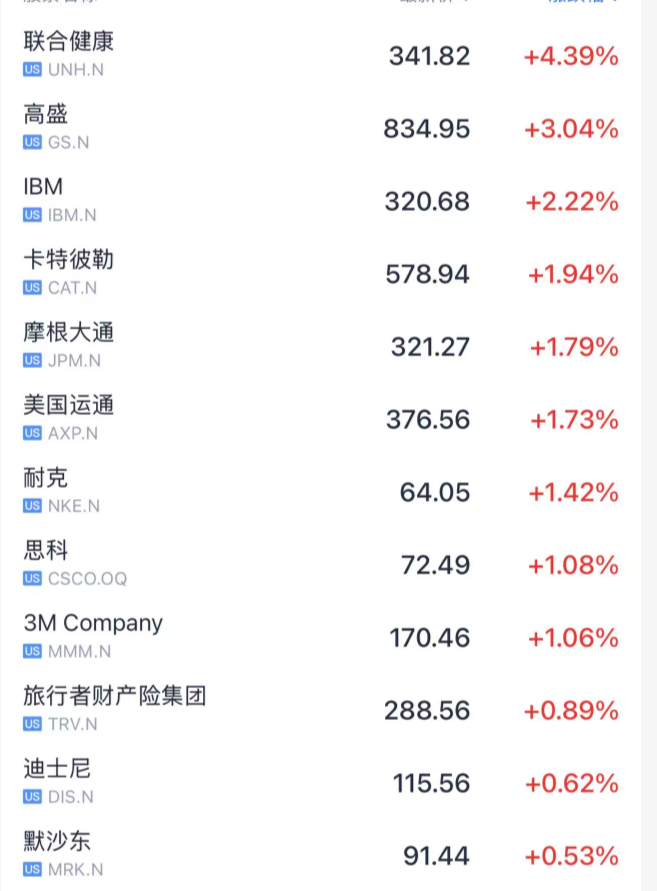 道指的相对强势得益于高盛、摩根大通和美国运通等重要金融股走高。这三只股票当天均创下新高。联合健康、IBM和耐克等个股的走强也提振了该指数。摩根士丹利、富国银行和美国银行等也创出新高。