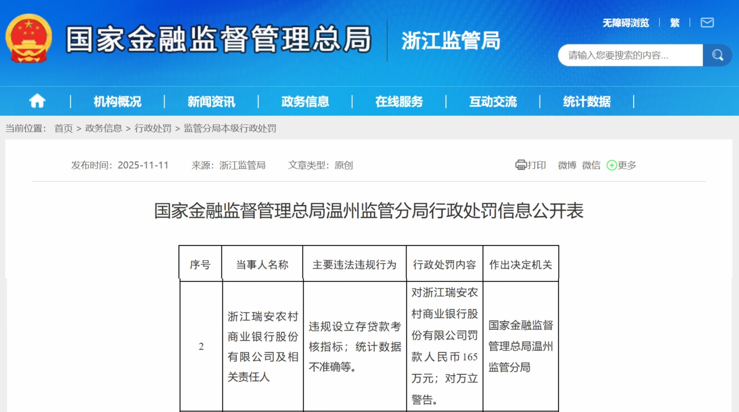 11月11日,国家金融监督管理总局温州监管分局披露的行政处罚信息公开表显示,对浙江瑞安农村商业银行股份有限公司(下称“瑞安农商行”)罚款165万元,并对万立警告,涉及的主要违法违规行为包括违规设立存贷款考核指标、统计数据不准确等。