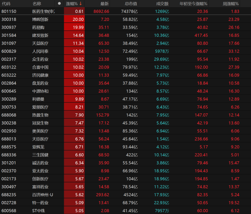 医药生物年内累计涨逾20%,博晖创新、药易购“20cm”涨停,建发致新、天益医疗涨势超过10%,人民同泰、众生药业、合富中国、济民健康、盘龙药业涨停。
