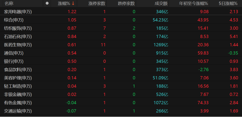 家用电器、综合、纺织服饰、石油石化、医药生物等板块收红,开能健康“20cm”涨停,三木集团、粤桂股份、南京新百、九牧王、孚日股份、康隆达、真爱美家、石化油服、准油股份等多股涨停。