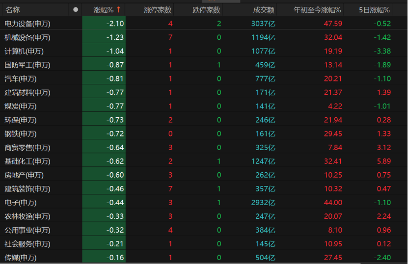 电力设备板块跌逾2%,年内涨幅缩至47.59%,阿斯特、艾罗能源领跌,神马电力跌停,但摩恩电气、中利集团、天际股份、石大胜华涨停。此外,机械设备、计算机、国防军工、汽车板块也收跌。